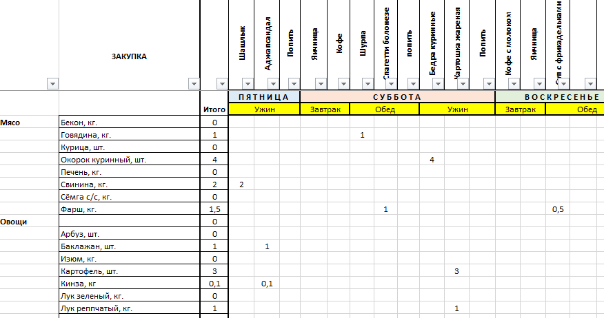 Пока не придумал эту табличку долго мучался составляя списки необходимых закупок. Часто забывал что-то прикупить. Теперь делаю это легко и не принужденно. Главное не нужно каждый раз думать куда всё записать, как потом считать сколько и чего закупить. Сейчас все сложения происходят автоматически. Столбик "А" - группа продуктов, например; мясо, овощи, хлеб, гастроном и т.д.; Столбик "В" - наименование продукта (вписываем в нужную группу, так легче ориентироваться в отделах в магазине) и единицы измерения; Столбик "С" - колонка "Итого" (сюда вбита формула куда плюсуется количество из любого следующего столбика). Остальные столбики - это "название блюда". Так как мы каждые выходные ездим на дачу, я разделил столбики на дни недели и дополнительно на приёмы пищи. Если делаю список для праздничного стола, то просто не обращаю внимания на дни недели. Для примера: Пишем вверху название блюда "ШАШЛЫК", далее в группах товаров пишем строку "Свинина, кг". Далее на пересечении шашлыка и свинины