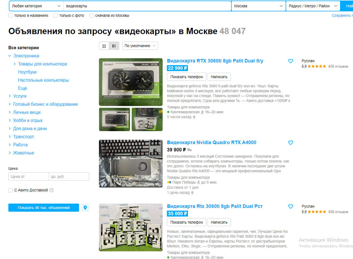 Много кто сейчас задумывается о покупке видеокарты из-за падения цен на них, но многие боятся сейчас идти на Б/у рынок за видеокартой. Ведь биткоин упал и майнеры побежали продавать свои видеокарты. Но у меня есть вопрос. Вы и вправду думаете что лучше купить видеокарту у геймера. чем у майнера? Если да, то я вам скажу что зачастую майнеры ухаживают за своими видеокартами лучше чем геймеры. Майнеры постоянно чистят свои видеокарты от пыли в отличие от геймеров которые дай бог раз в пол года их чистят. Итак, поговорим чего стоит опасаться на авито. В первую очередь стоит смотреть на профиль продавца и отзывы, если аккаунт новый и почти без объявлений или с плохими отзывами, то такое объявление лучше обойти стороной. Во вторых, не стоит вестись на очень низкие цены. В третьих, старайтесь договорится с продавцом о встрече у него дома для проверки видеокарты и не пользуйтесь авито доставкой, потому что вам могут отправить что угодно вместо видеокарты. Теперь поговорим про несколько мифов.