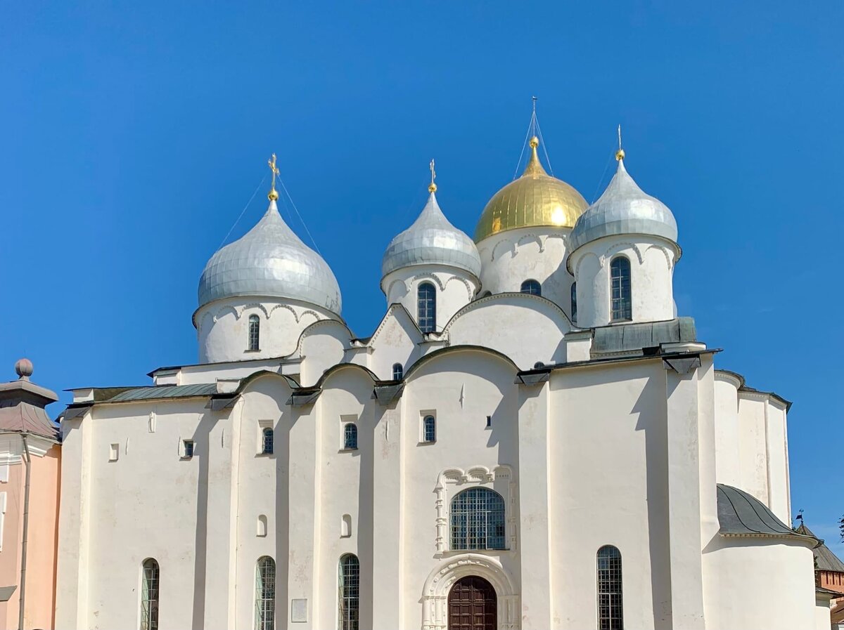1. Софийский Собор в Новгороде. Софийский Собор в Новгороде был заложен в 1045г. при Ярославе Мудром. Собор сочетал в себе славянские и византийские традиции. На Соборе всего лишь 5 куполов, расположенных в четком симметричном порядке. Мощные стены сложены из известняка. Внутри Храма нет ярких мозаик, а только суровые и спокойные фрески. София стала символом Великого Новгорода. После строительства Собора, Новгородская архитектура начинает приобретать новые черты- скупость украшений, строгость и величественность форм. Софийский Собор единственное сооружение того времени, дошедшее до наших дней почти без изменений. Также Софийский Собор является самым старинным Собором на территории России. 2. Успенский Собор во Владимире. В 1158 г. князем Андреем Боголюбским было заложено строительство Успенского Собора во Владимире. Собор построен на крутом берегу реки Клязьмы. По итогу строительства Успенский Собор оказался самой высокой постройкой на Руси того времени, 32 метра. Собор был богат