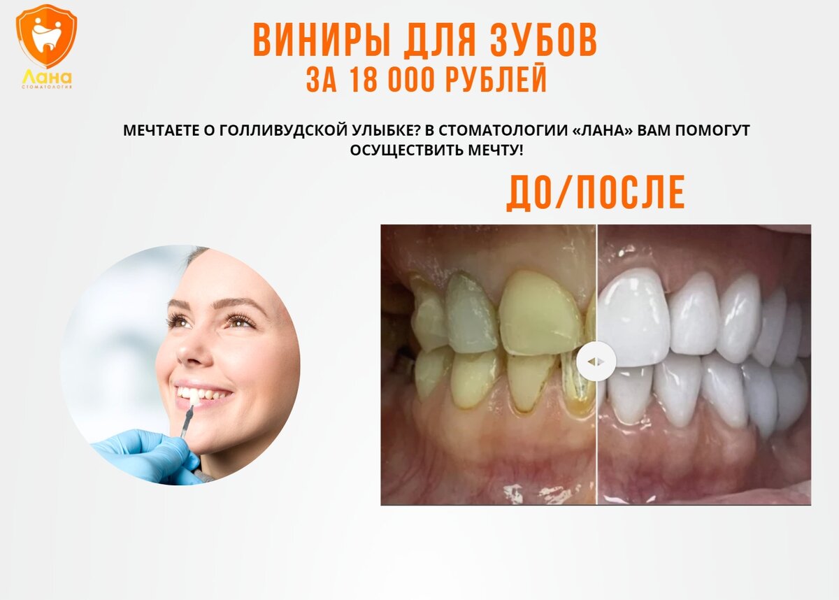 Мечтаете о голливудской улыбке? В Стоматологии «Лана» вам помогут осуществить мечту! Весь секрет заключается в относительно новых системах для мгновенного восстановления эстетики улыбки – виниров. Конструкция представляет собой тоненькую пластинку, которая накладывается на поверхность зуба и прикрывает существующие деффекты и недостатки.