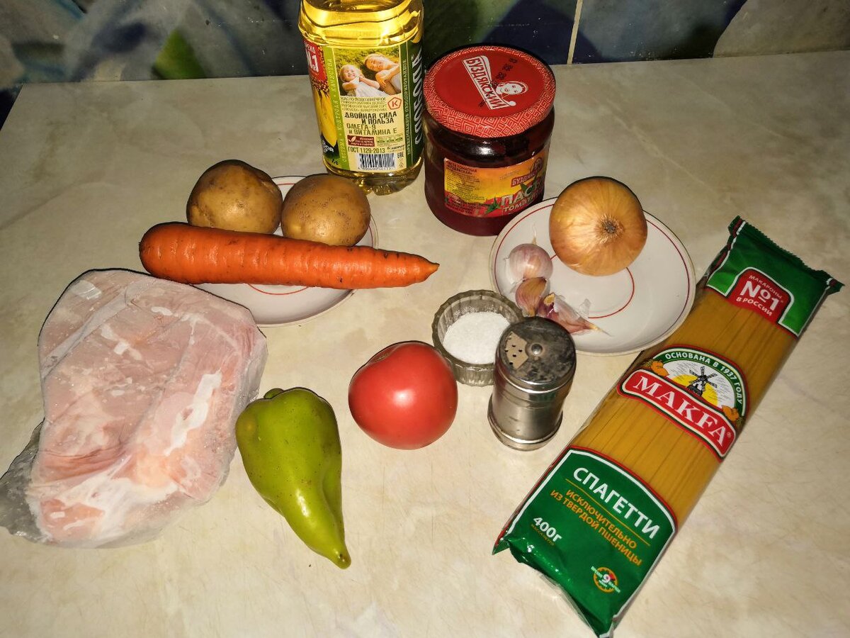 Лагман - это одновременно и первое и основное блюдо, всё зависит от количества бульона. Для приготовления лагмана нам понадобится: Лук нарежем полукольцами, перец - полосками. Морковь натрём на крупной терке (или порежем небольшими полосками). Картофель нарежем небольшими кубиками. Чеснок очищаем и мелко нарезаем или протираем на мелкой тёрке.. Томат очищаем от кожи (подержав в кипятке) и отрезаем плодоножку; нарезаем дольками. Мясо нарезаем полосками среднего размера. В толстостенную кастрюлю наливаем растительное масло и выкладываем мясо. Обжариваем до золотистого цвета. Выкладываем лук и обжариваем 5 минут. Выкладываем морковь и обжариваем 5 минут. Далее выкладываем перец, томаты, чеснок, томатную пасту, и картофель. Добавляем воду, солим и перчим. Варим на среднем огне 40 минут. За 5 минут можно добавить зелень, либо подать зелень на стол. В подсоленной воде отвариваем спагетти. Выкладываем в тарелку лапшу, а сверху наливаем подлив. Приятного аппетита!