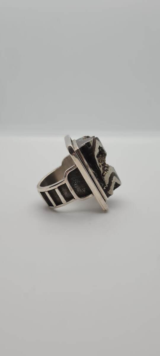 Наш новый перстень "След протектора" с пиритизированным аммонитом выполнен вручную в единственном экземпляре. Контрастное, яркое, графичное украшение. Прошу обратить внимание на маленькие кристаллики пирита в узорах углублений. Отраженный свет от граней кристаллов выделяет их в гладкой металлической поверхности окаменелого моллюска. А строгое, геометричное обрамление, выполненное Ольгой Радомской - ещё больше подчёркивает уникальность материала