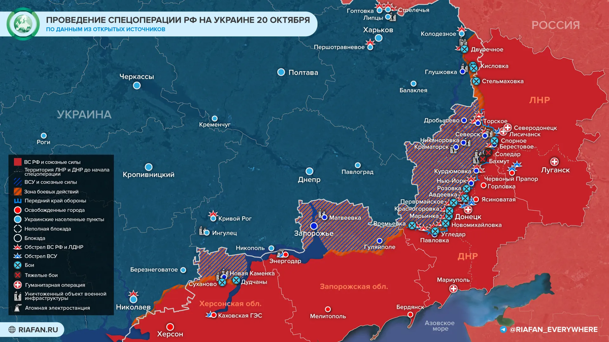 Ударами оперативно-тактической и армейской авиации, ракетных войск и артиллерии поражены три пункта управления ВСУ, а также 72 артиллерийских подразделения на огневых позициях, живая сила и военная техника в 179-ти районах. Кроме того, поражены пять пунктов временной дислокации ВСУ. Уничтожены четыре склада боеприпасов. В районе Ингульца (Днепропетровская обл.) уничтожены хранилища топлива для военной техники ВСУ. Также уничтожены радиолокационная станция контрбатарейной борьбы AN/TPQ-36 производства США и радиолокационная станция обнаружения маловысотных целей СТ-68УМ. В ходе ведения контрбатарейной борьбы нанесено поражение украинской батарее РСЗО «Ольха» в районе н.п. Липцы (Харьковская обл.). Средствами ПВО сбит вертолет Ми-8 воздушных сил Украины. Также сбиты в воздухе 18 украинских БПЛА и перехвачены три снаряда РСЗО «Ольха». Авдеевское и Кураховское направления. Артиллерия российской армии продолжает интенсивную работу по укрепрайонам противника. В н.п. Первомайское продолжаются