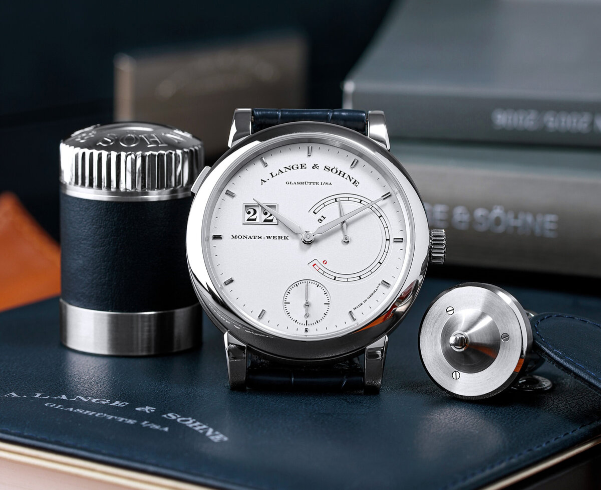 В лучших традициях "Ланге", брендирование представлено аккуратной печатью, где особенной гордостью отличаются надписи "Monats-werk" (месячный механизм) и "Made in Germany".