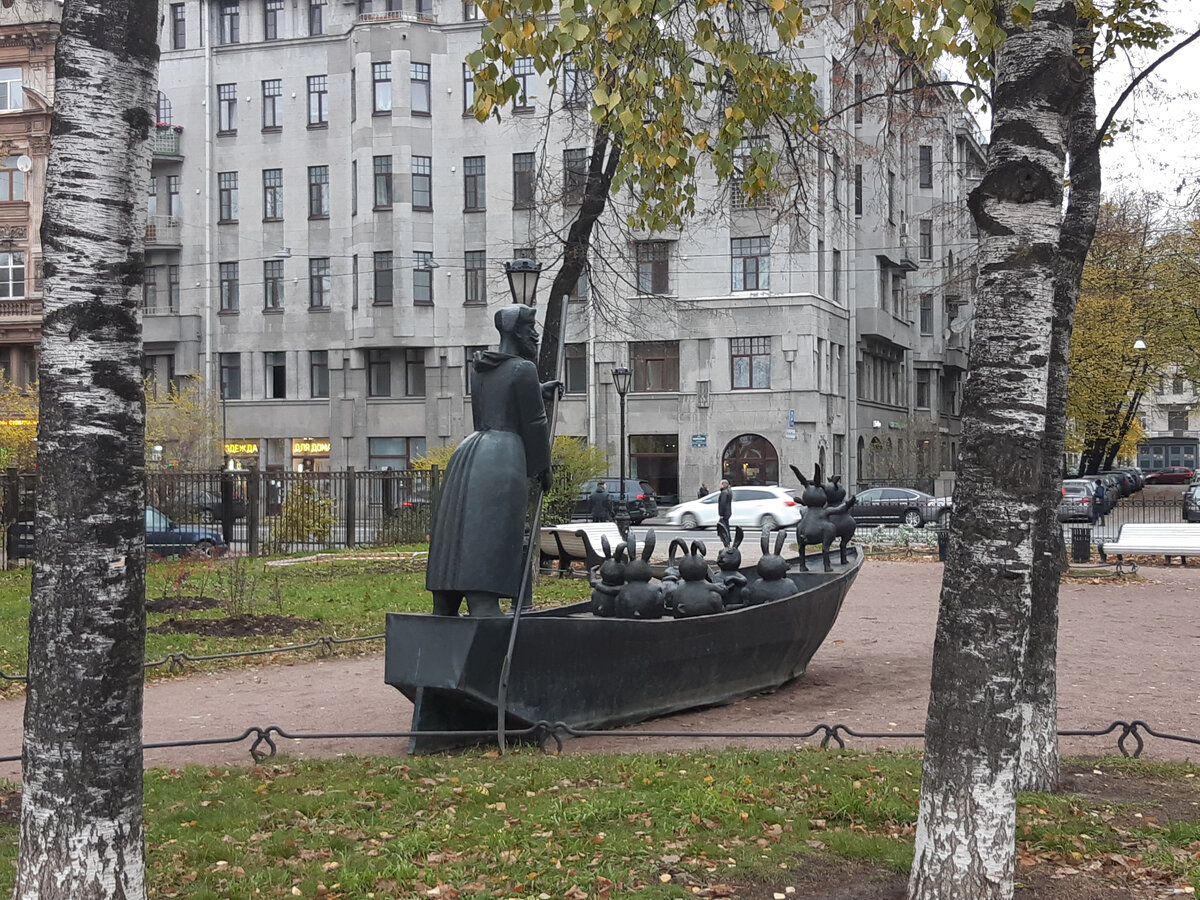 Совсем недавно, 9 октября текущего года, к скульптурам, установленным в Петербурге, добавилась ещё одна, притом в виде целой группы. Она появилась в Некрасовском саду, который расположен у перекрестка Греческого проспекта и улицы Некрасова. Эта скульптурная группа явно выполнена по мотивам произведения Н. А. Некрасова «Дедушка Мазай и зайцы». По данным портала Фонтанка, её автором является московский художник А. Таратынов. Изначально она была установлена в московском парке имени Горького, но часто страдала там от вандализма, для устранения последствий которого и была отправлена обратно в мастерскую автора. Из мастерской, через его музей, эта скульптурная композиция переехала в Петербург. В этом памятнике мы видим ироническое прочтение произведения русского классика с добавлением к нему современных мотивов. Начнём с носа лодки. Здесь мы видим явно разнополую пару зайцев с антропоморфными признаками. Это явная отсылка к известному голливудскому фильму «Титаник» Д. Кемерона 1997 года. Уч