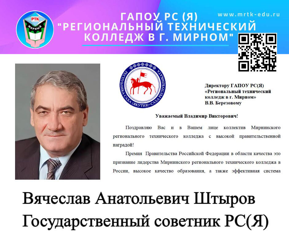 Государственный советник Якутии В.А. Штыров направил поздравление МРТК с высокой правительственной наградой. Уважаемый Владимир Викторович! Поздравляю Вас и в Вашем лице коллектив Мирнинского регионального технического колледжа с высокой правительственной наградой! Премия Правительства Российской Федерации в области качества - это признание лидерства Мирнинского регионального технического колледжа в России, высокое качество образования, а также эффективная система управления. За этой высокой оценкой, результатами стоит огромный труд коллектива колледжа, профессионализм управленческой команды, а главное – это Ваш высочайший профессионализм, блестящие организаторские способности, чувство гражданской ответственности и требовательность в сочетании с чутким и внимательным отношением к людям. Владимир Викторович, именно с Вами связаны многочисленные достижения колледжа, развития колледжа, Вы не останавливаетесь на достигнутом, последовательно повышаете «планку», формируете стандарты в своей