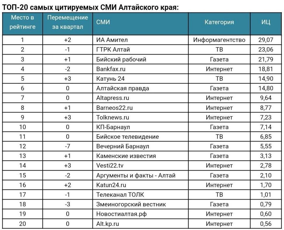 Компания «Медиалогия» подготовила рейтинг медиаресурсов Алтайского края за III квартал 2022 года. В обновлённом списке ИА «Амител» занял первое место. По сравнению с показателями за II квартал мы поднялись сразу на две позиции и возглавили рейтинг. Вторую строчку заняла ГТРК «Алтай», потерявшая одну позицию, а на третьей строчке оказалось издание «Бийский рабочий», которое поднялось на одну строчку выше. «При расчёте рейтингов не учитывается взаимная перекрёстная цитируемость, если она масштабна и носит регулярный характер. Специалистами „Медиалогии“ разработан математический алгоритм, который выявляет устойчивые пары СМИ, а также автоматически определяет допустимый порог аномальности на основании анализа взаимного цитирования у других СМИ. Цитаты между СМИ, уровень взаимного цитирования у которых превысил порог аномальности, исключаются из общего результата данных СМИ», — сказано в сообщении «Медиалогии». Исследование проводилось в период с 1 июля по 30 сентября 2022 года.