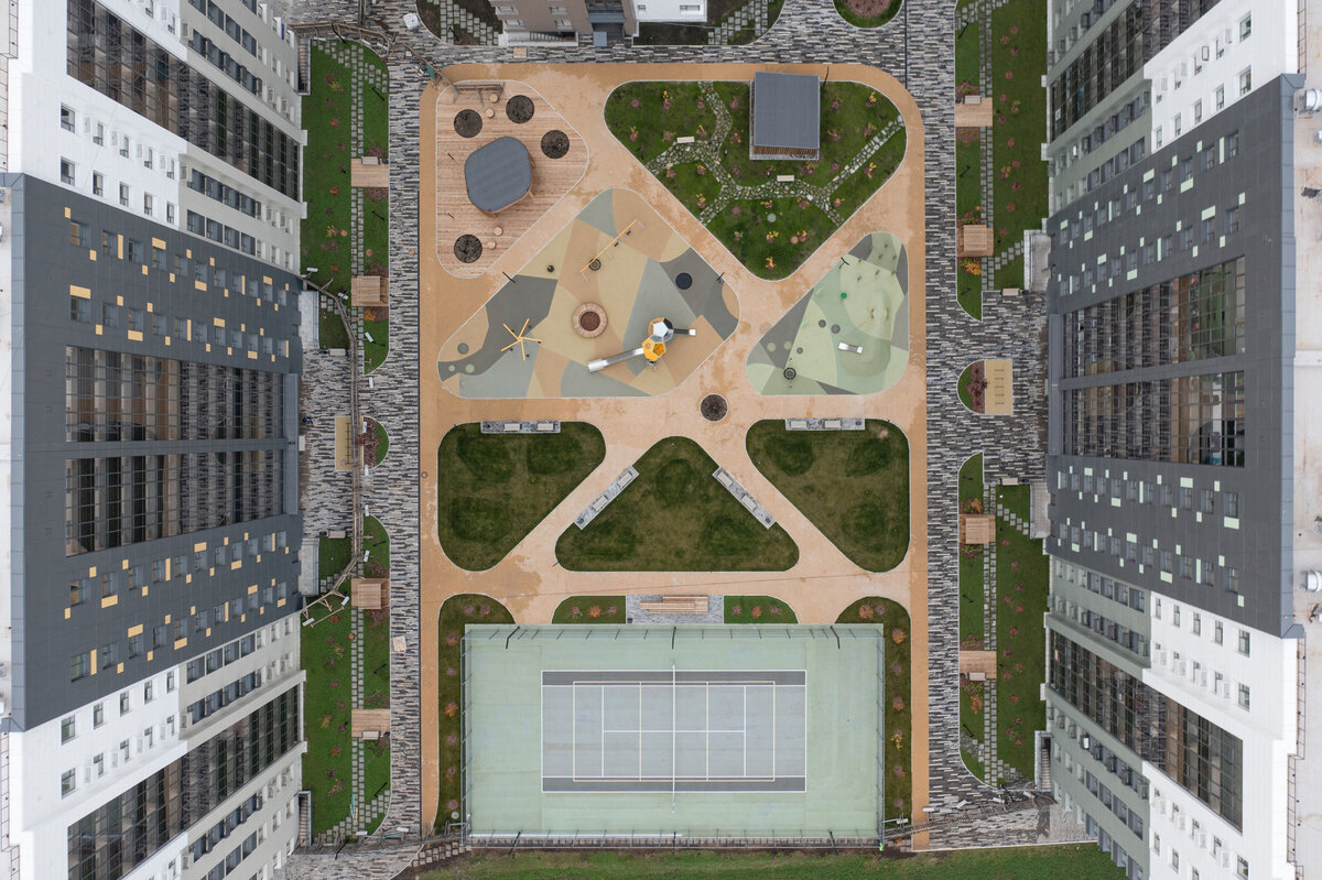 - дворы-парки без машин с игровыми детскими площадками, теннисным кортом и местами для отдыха;