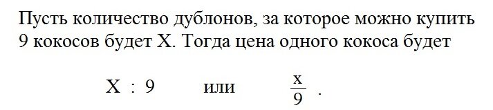 Основное свойство пропорции Уважаемые мамы и папы, дедушки и бабушки! Предлагаю вам решение задачи 626 из 7-го издания учебника по математике для 6-го класса авторов А. Г. Мерзляка, В. Б. Полонского и М. С. Якира под редакцией. В. Е Подольского. Условие: Девять кокосов стоит столько дублонов, сколько кокосов можно купить за 1 дублон. Сколько стоит 15 кокосов? Решение: Из условия задачи известно, что количество кокосов, которое можно купить за 1 дублон, равно количеству дублонов, за которое можно купить 9 кокосов – то есть тоже х. Получается, что цену одного кокоса можно найти и вторым путём – разделив 1 на x. Следовательно: Решить эту пропорцию нам поможет основное свойство пропорции, которое авторы учебника дают в §20: Произведение крайних членов пропорции равно произведению её средних членов. Это означает: если a : b = c : d, то ad = bc (числа a и d называют крайними членами пропорции, а числа b и c – средними членами пропорции). Например: 20 : 4 = 30 : 6 и 20 * 6 = 4 * 30 – то ест