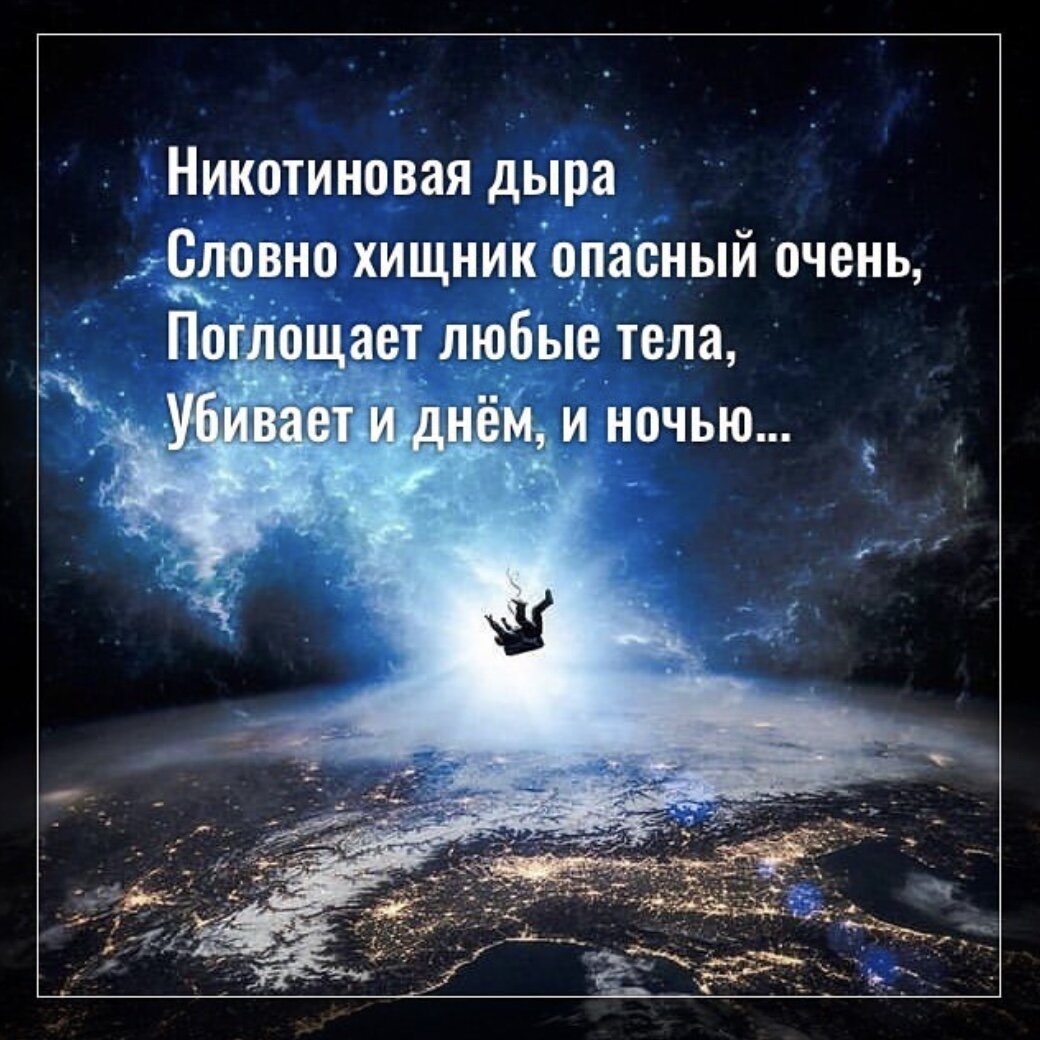 Никотиновая дыра Словно хищник опасный очень, Поглощает любые тела, Убивает и днём, и ночью. Разъедает способности видеть То, что шлёт вам с небес источник, Начинаете мир ненавидеть, Не читаете текст между строчек, Одурманивает и грызёт Сверху светлый и мощный поток, И всё чаще в делах не везёт, Упирается Дух в потолок. Вы себя продаёте легко Непонятным завесам дыма, До истины так далеко, Ваша жизнь здесь неповторима! А Вы тратите на ерунду Силы свои и способности, Не имея плохого в виду, Создаёте ужасные новости Для Вселенной и окружения, Затушите убийцу сознания, У Души попросите прощения, Что даёте ей яд в наказание. 🙌✨