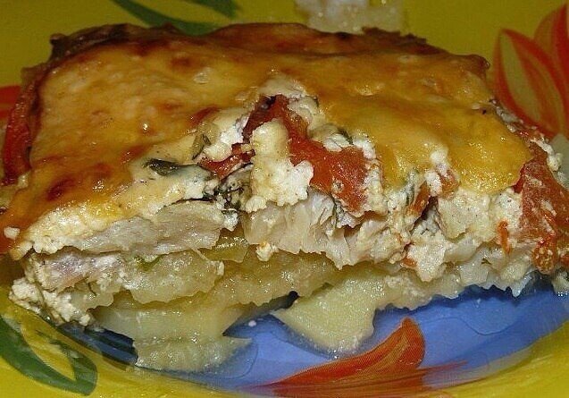Получается изумительная хрустящая сырная корочка! И рыбка, и картошка в сливках со специями приобретают нежный пикантный вкус! Быстро, легко и вкусно! Рецепт для уютного семейного ужина, все будут довольны и сыты. Ингредиенты: Картофель — 5–6 шт. Рыба — 500 г Помидоры — 2 шт. Крупный репчатый лук — 1 шт. Сыр Зелень Сливки Приготовление: Сливки можно заменить рыбным бульоном. И тогда верхний слой вместо сыра можно выложить луком со сладким перцем, будет не менее вкусно. 1. Картофель режем кружочками потоньше, лук кольцами или полукольцами, помидоры тоже можно нарезать кольцами или полукольцами, рыбку — небольшими кусочками. 2. Сыр не трем на терке, как обычно, а нарезаем тонкими пластиночками — как на бутерброд. Зелень мелко рубим. 3. В сливки добавляем соль, перчик, можно еще какие-нибудь специи для рыбки. 4. В форму сначала выкладываем слой картофеля, затем лучок, затем рыбу. Слегка солим, посыпаем зеленью и хорошо смазываем сливками (или поливаем — все зависит от жирности сливок). За