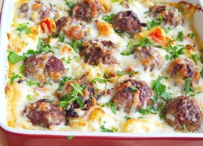 800 г картофеля 200 мл молока 2 ст. л. сливочного масла тертый мускатный орех, молотая паприка 7 маленьких помидор 1 луковица 400 г мясного фарша 2 ст. л. растительного масла 50 гр. тертого сыра петрушка рубленная - 1 ст. л. базилик рубленный - 1 ст. л. соль, молотый черный перец 1. Отварить картофель и размять в горячем виде. Посолить, поперчить и приправить мускатным орехом. Добавить горячее молоко и сливочное масло. Помидоры нарезать кубиками и подмешать к пюре. Выложить пюре в смазанную маслом форму для запекания. 2. Мелко нарезать лук. Перемешать лук с мясом. Добавьте соль, паприку и мускатный орех. Скатать ровные шарики. Обжарить получившиеся фрикадельки на растительном масле в течение 5 минут. Фрикадельки выложить на пюре (вместе с жиром от жаренья). Посыпать блюдо тертым сыром и запекать (в разогретой до 200°С духовке) 15 минут. 3. Готовое блюдо посыпать петрушкой и подать к столу.