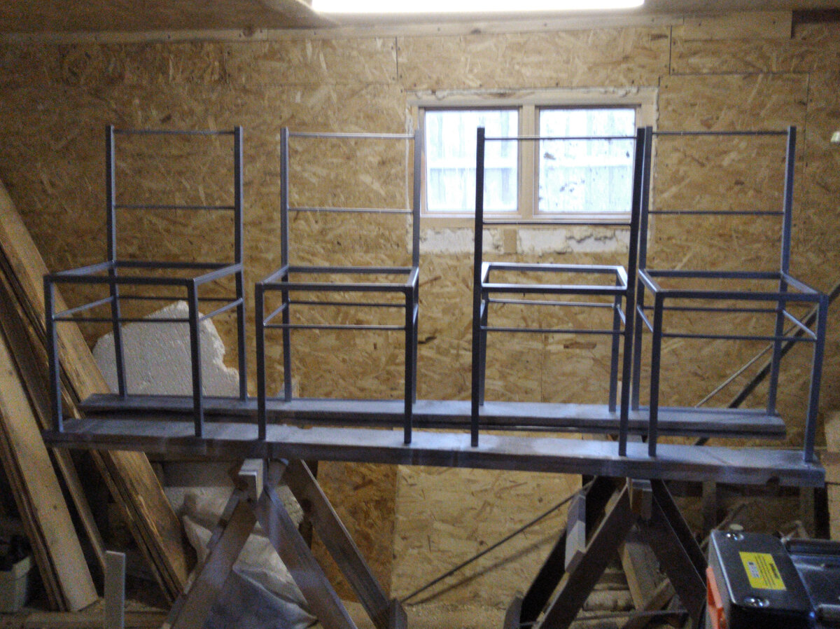 В этой статье покажу, как изготавливал стулья в стиле лофт из металлической профильной трубы. Это был заказ, поэтому цвет и все остальное изготавливалось по требованию заказчика, который предоставил фото изделия и указал свои пожелания. Изготовление каркаса стульев из металлического профиля Заказ поступил на четыре стула, поэтому изготавливал их по частям, операциями. Сначала приступил к сварочным работам для изготовления каркасов. По требованию заказчика на стулья пошла профильная труба 20х20 и 10х10 мм. Он был прав, таких размеров трубы вполне хватило для стульев и они получились легкими и красивыми. После изготовления получились вот такие черновые заготовки стульев. Все углы зачистил от сварки, чтобы не было видно сварочных швов. Просверлил отверстия в местах крепления сидений и спинок. Выровнял ножки при помощи ровного листа ЛДСП, чтобы стул стоял на полу ровно. Можно было установить регулируемые по высоте ножки, что упростило бы задачу, заказчик отказался. Попросил обычные п