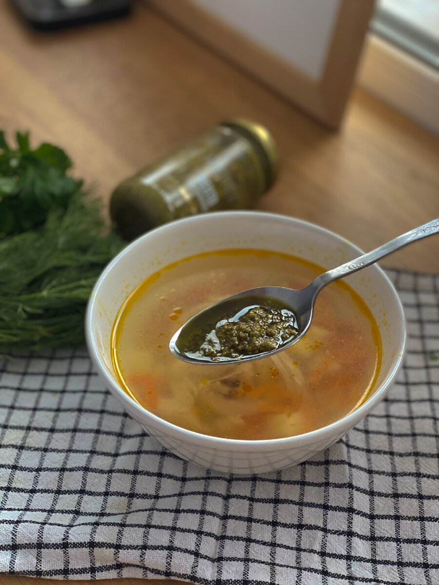 Как разнообразить куриный суп?🤔 Добавить ароматный соус песто🍲 ⠀ Для приготовления супа нам понадобится: •Куриная грудка; •Морковь; •Картофель; •Луковица; •Соль и перец; ⠀ Для соуса песто понадобится: •Пучок петрушки; •Чеснок 2 зубчика; •Орехи грецкие и кедровые 40-50г.; •Оливковое масло. ⠀ Способ приготовления супа: 1. Готовим бульон. Куриную грудку и очищенную луковицу отвариваем в двухлитровой кастрюле в течении 30 минут. 2. Далее достаём курицу, остужаем и делим на кусочки. 3. В бульон добавляем очищенный картофель, который предварительно мы нарезаем на небольшие кусочки. Варим в течении 10 минут. 4. Морковь натираем на крупной тёрке, обжариваем на сковороде с растительным маслом в течении 5 минут. 5. Морковь и курицу добавляем в бульон с картофелем, солим и перчим, варим ещё минут 10 на среднем огне. 6. Готовим соус песто: смешиваем все ингредиенты в блендере, добавляем масло и подаём соус с супом. ⠀ Всего лишь один ингредиент может изменить вкус Всего лишь один ингредиент