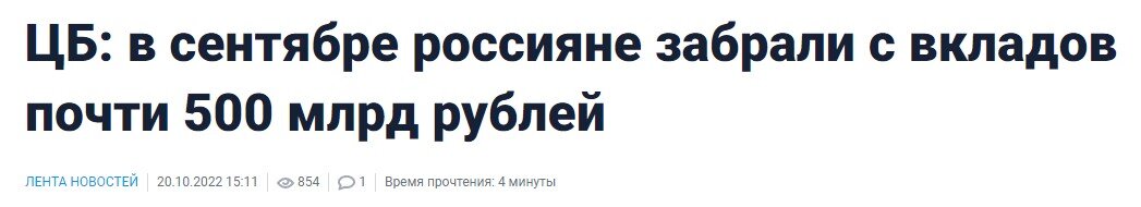 Объем вкладов населения в российских банках по итогам сентября сократился на 458 млрд рублей - констатирует ЦБ в своем докладе "О развитии банковского сектора РФ в сентябре 2022 года". "Средства населения снизились по итогам сентября на 458 млрд рублей (минус 1,4%), отток пришелся на вторую половину месяца, когда увеличилось количество уехавших из страны людей, которые брали с собой наличные деньги. Кроме того, граждане склонны снимать наличные средства в ситуации стресса или неопределенности, как это было, например, в начале года, но потом обычно возвращают деньги в банки", - констатирует Банк России. В большей степени этот отток пришелся на валютные вклады (которые еще до сих пор оставались, как ни странно) - их сняли на сумму 427 млрд рублей, или 10% всех размещенных средств в валюте. Рублевые вклады снизились незначительно - только на 31 млрд рублей или 0,1%. Ранее сообщалось, что всего из банков после 21 сентября изъяли около 750 млрд рублей, теперь видно, что почти 500 млрд из ни