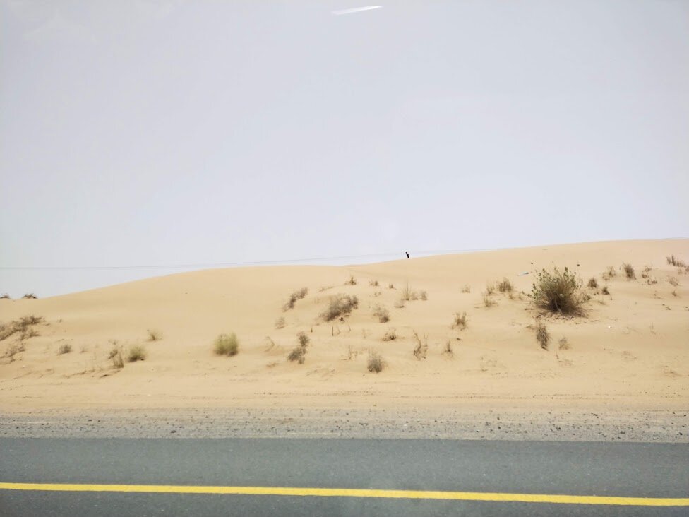 Солнце есть. Песок есть. Притяжение есть. Где мы?... ("Кин-дза-дза") А мы на Аравийском полуострове, дорогие читатели:) После городских картинок небоскребного Дубая перед нами открылись совершенно другие пейзажи. Почему-то вспомнился фильм "Кин-дза-дза") Желтые пески: Одинокие деревья: Где три дерева - уже лес:) Потом стали появляться горные невысокие, пока совсем не высокие, хребты, покрытые скудной растительностью: Потом - горы повыше, потемнее: На фото, которое ниже, видно, что дороги, проложенные в горах, укреплены специальными ограждениями. А теперь вернёмся к той же фотографии, которая теперь выше. Вы обратили внимание, в верхней части фотографии есть какое-то цветное изображение на скале? Интересно, что бы это могло быть?... и кто бы это мог сотворить? "Здесь были Киса и Ося"?..)) А потом я увидела вот такой горный склон - удивилась. Потом поняла, что это тоже так укрепляют горные склоны. Что-то типа бетона, видимо. В некоторых местах вдоль дороги тянулись проволочные ог