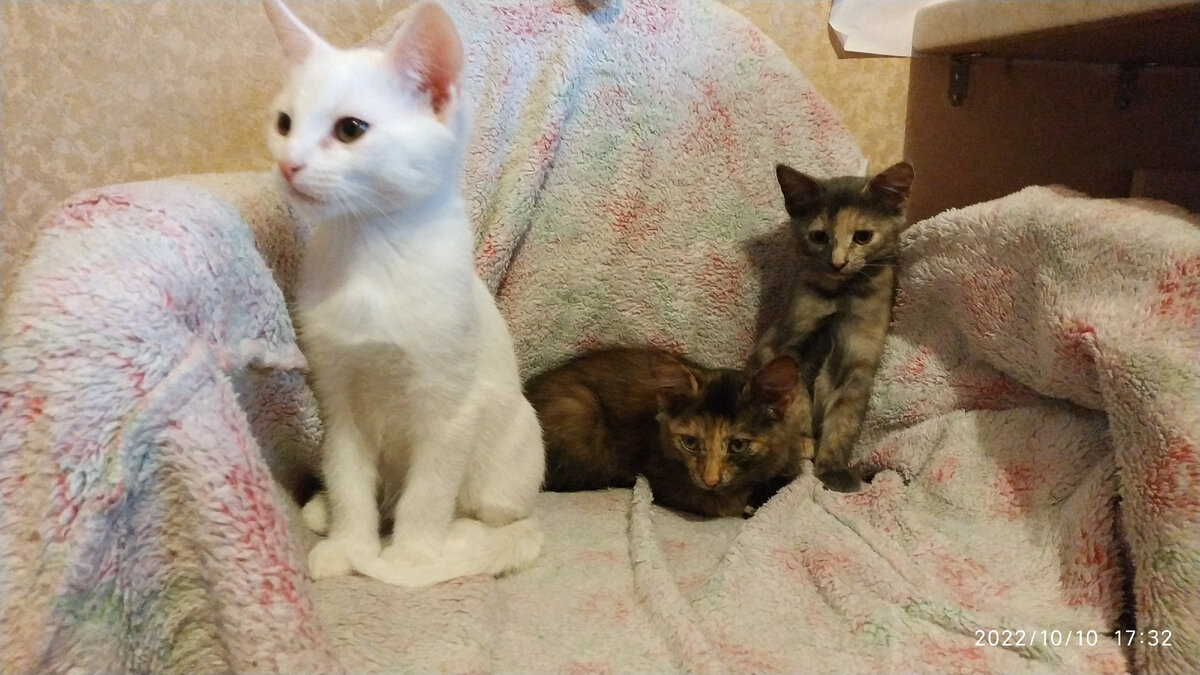 Ищем дом для трёх котят, рожденых 27.07.22. Мама-кошка была найдена уже беременной, но она точно раньше жила дома, т.к. ноготки были подстрижены, лоток знала. Детки с лотком дружат, едят сухой и влажный корм, от глистов обработаны. 1. Мальчик Бобби, натуральный блондин, достаточно спокойный, изобретательный в играх, самодостаточен. На руках долго не сидит, не навязывает своего общества, покушать любит. Если будет одним питомцем, будет ориентирован на человека больше. Любит повозиться с водой. 2. Люси, серенькая девочка-дюймовочка. Тихонечко сама с собой играет в уголочке, подолгу может смотреть, как капает вода из крана, кушает мало, на ручки не просится. Если брат с сестрой затевают игры, участвует с удовольствием, но игру покидает первой. Если днём все на работе, спокойно будет ждать родителей. 3. Самая обаятельная и привлекательная, девочка-зажигалочка. Умудрилась втереться в доверие даже к нашему суровому коту. Очень любит общение с человеком, любит активности, любит помогать по хо
