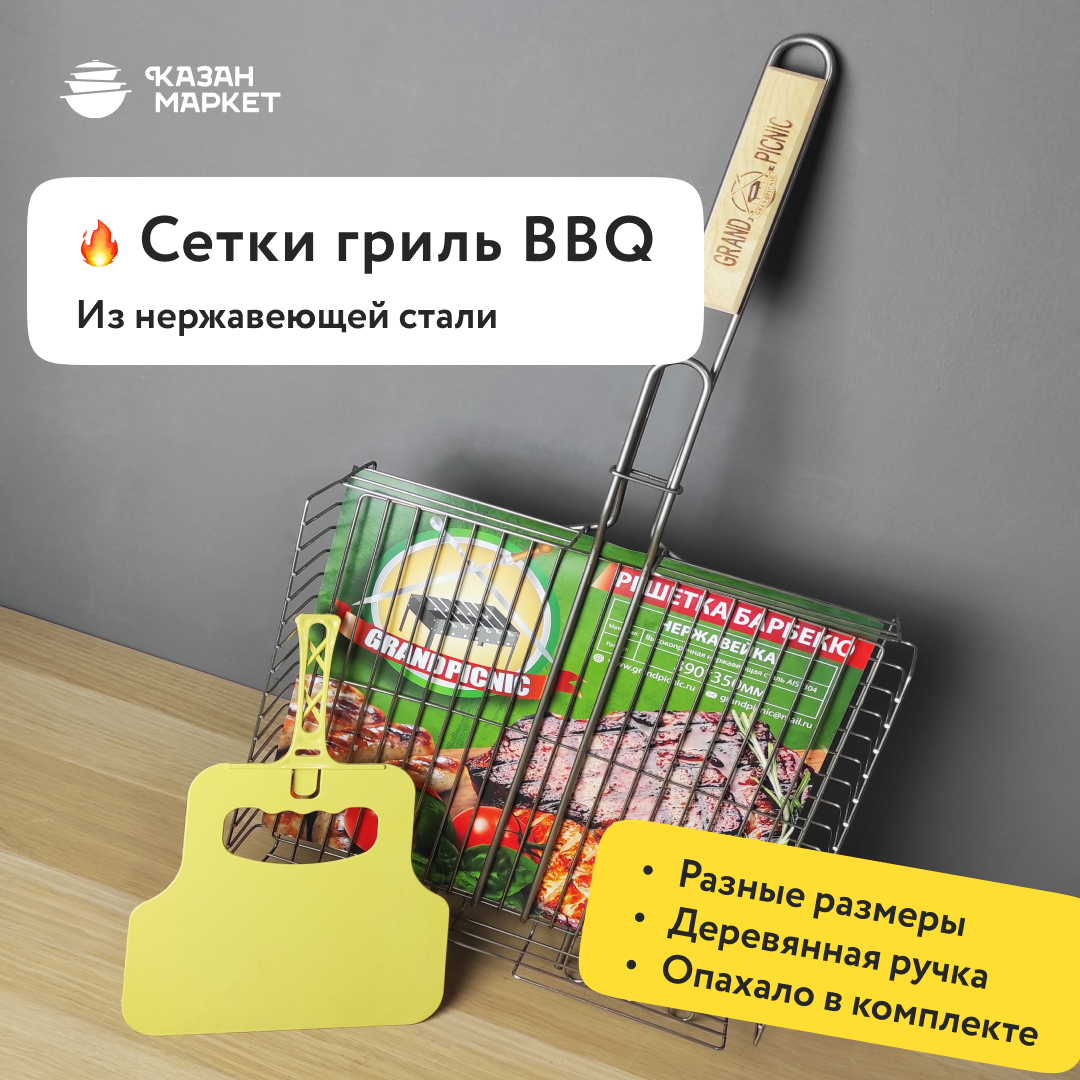 Кроме шампуров у нас в наличие есть также сетки для BBQ из нержавеющей стали. Сетки представлены трех разных размеров. Выполнены они из прочной нержавеющей стали с деревянной ручкой. Она позволяет не только приготовить блюда, которые было бы сложно сделать на шампурах (большие стейки из мяса или рыбы, бифштекс или колбаски) но также она намного удобнее если у вас большое количество мяса, времени на готовку уходит значительно меньше. Как приятный бонус, опахало для мангала в комплекте. Для уточнения размеров и заказа просто напишите нам в сообщения группы - vk.me/kazanrb или в комментариях и мы вас обязательно проконсультируем. Или приезжайте в наши магазины Казан-Маркет по адресам: ул. Мустая Карима, 42 (пн-пт с 10:00 до 19:00, сб с 11:00 до 17:00) ул. Трамвайная, 5а/1 (пн-пт с 10:00 до 19:00)