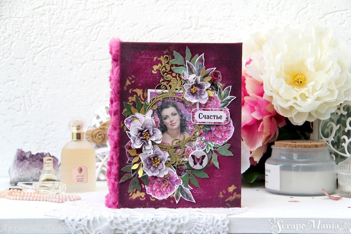 Всем привет! Сегодня с вами я, Любовь Архипова. В это году время цветения пионов я пропустила. А теперь наверстываю его с коллекцией "Пионовый роман" ТМ ScrapMania. Наслаждаюсь от работы с этой бумагой, с этими рисунками. Она будто пропитана ароматом пионов. И из нее мне очень захотелось сделать альбом, очень нежный, чувственный, элегантный, чтобы подчеркнуть красоту бумаги. Ткань на обложку подбирала долго. В итоге остановилась на однотонном хлопке насыщенного цвета фуксии и плюше в розочку почти такого же цвета. Решила усложнить фон из хлопка штампингом текста белыми чернилами, нанесением золотой краски через трафарет и затемнением воском. Получилось отлично, на мой взгляд, и очень подходит под внутреннее содержимое альбома. Так же обложку украшают тканевая карточка "Пионовый роман. Любовь в твоих глазах", вырезалки с листа бумаги "Пионовый роман. Цветы" и листа веллума А4 "Пионовый роман" . Надпись взяла со скрап-карты А4 "Пионовый роман. Ярлыки и теги" и добавила в композицию фишк