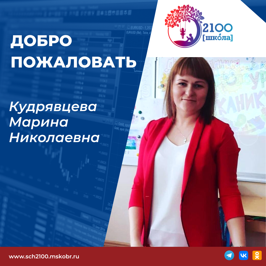 🥳 В этом учебном году наш профессиональный коллектив пополнился новым учителем начальных классов! Добро пожаловать, Кудрявцева Марина Николаевна! 🧑🏼🏫 Марина Николаевна: «Я работаю учителем 13 лет. Вопрос выбора профессии для меня не был сложным. После окончания школы я уже точно знала, что стану учителем. Быть учителем - трудно, но интересно. Я с удовольствием веду уроки, готовлю для ребят классные и школьные мероприятия, у меня хорошие отношения с детьми. Все это не мешает мне быть в меру строгим и требовательным педагогом. 🔍 На своих уроках я использую различные методы и формы работы: - проблемные методы; - метод проектов; - интегрированные уроки; - работу в группах; - работу в парах; - интерактивные и творческие задания. ☺️ Наверное самое трудное в школе для меня - это не стоять на месте, постоянно двигаться вперёд, развиваться вместе с моими учениками. Нужно стараться стремиться и узнавать всё новое более активно, чем ученики - для того, чтобы вести их за собой. Я всегд