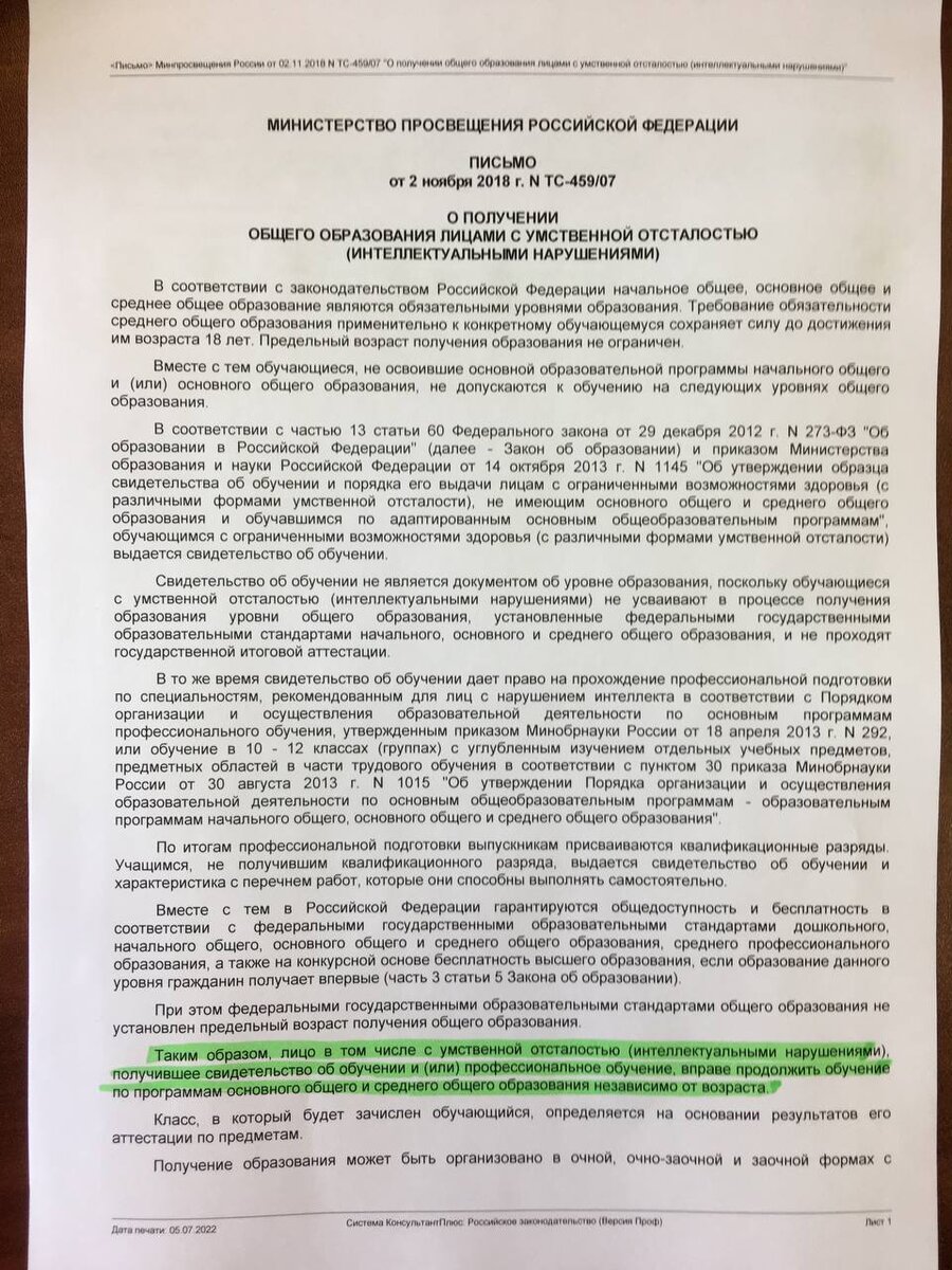 Ответ: да! Можно! Есть специальный документ: письмо от минпросвещения Основное общее образование и среднее общее образование – это 5-9 и 10-11 класс общеобразовательной школы. ВНИМАНИЕ: в документе нигде не сказано, что нужно снимать диагноз ИН (УО) Однако, в моём случае, всё как всегда не так просто. Детство Когда я была в 5 классе, кто-то из врачей маму надоумил за меня бороться и она послушала того детского врача. Проблема была в том, что в общеобразовательную школу меня после коррекционной школы-интерната 8 вида никто не брал, пришлось снимать диагноз, который был под вопросом. Но и диагноз снять не могли, врачи всегда говорили: 《у нас психолога нет》, а до Якутска не было возможности доехать и там проживать на время обследования. К тому же, была одна врач, которая считала все мои диагнозы верными, мама была с ними в конфликте. А ещё с 5 класса к нам домой начали ездить всякие комиссии, с целью отобрать у матери детей, которые были одеты, обуты, накормлены, еле фрукты и
