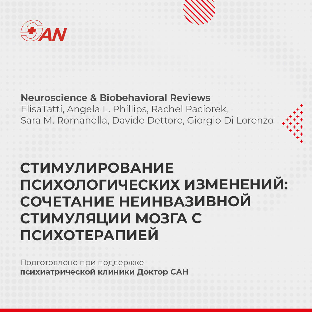Психические расстройства и расстройства, связанные с употреблением психоактивных веществ, являются ведущей причиной заболеваемости и смертности во всем мире и одной из самых серьезных проблем для систем общественного здравоохранения. В то время как психотерапия, основанная на доказательствах, обычно используется для решения проблем психического здоровья. Психологическим изменениям часто мешают несоблюдение режима лечения, рецидивы и житейские препятствия, например, отсутствие времени, денег. В последние десятилетия методы неинвазивной стимуляции мозга (НИСМ) стали многообещающими инструментами для прямого воздействия на дисфункциональные нейронные цепи и стимулирования долговременных пластических изменений. Терапевтическая эффективность протоколов НИСМ, используемая при психических заболеваниях, установила, что нейромодулирующие вмешательства также могут использоваться для поддержки процессов, активируемых психотерапией. Действительно, сочетание психотерапии с НИСМ может помочь адаптир