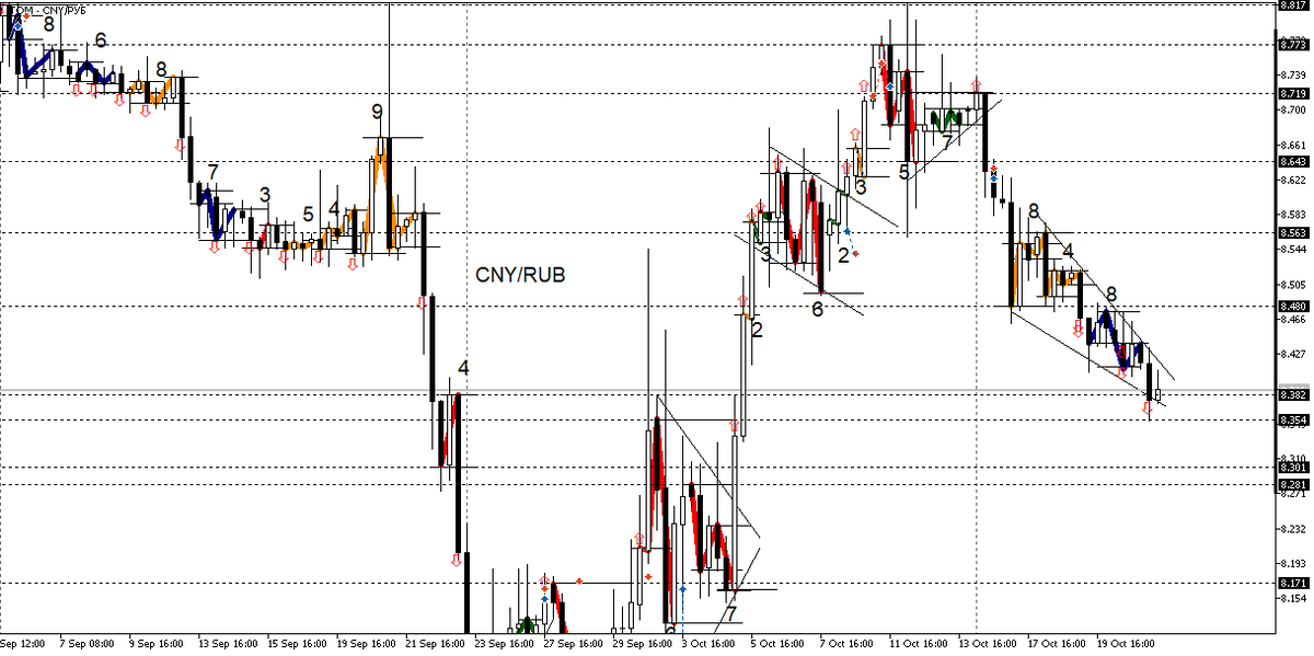 Китайская валюта продолжает постепенно терять свои позиции по отношению к рублю. В 12 МСК после закрытия 4-х часовой свечи в волновом балансе зафиксировался новый пакет (-2-2)(-2 - общей длительностью 20 свечей. Я проанализировал частоту встречаемости этой комбинации (-2-2)(-2 на истории и выяснил, что данная конструкция возникала на ценовом графике до текущего момента 5 раз. Из этих 5 случаев, 4 раза цена после этой конструкции продолжала снижаться далее, и только в 1 случае сформировала «ложный» разворот в виде одиночной модели +2 (пятиволновки). Анализ циклов на данный момент показывает, что на ценовом графике образовалось 2 цикла R1, состоящие из 3 волновых пакетов (-2/3) общей длительностью - 94 (или -47 свечей за цикл). В терминах рафтинга, такое препятствие имеет название "ДВОЙНОЙ ВАЛ". С точки зрения параметра интерференции (-0,67), такой барьер считается достаточно высоким, так как характеризуется таким же параметром интерференции, что и бочки (дробные циклы R) внутри пр
