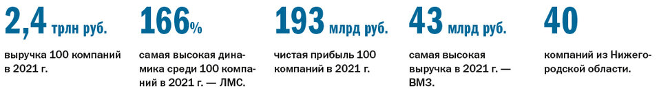 Как составлялся рейтинг На первом этапе создания рейтинга был сформирован перечень из более 5000 коммерческих компаний на основе данных системы «СПАРК-Интерфакс» за период 2020-2021 гг. со статусом действующего предприятия на июнь 2022 г. На втором этапе сформирован лонг-лист компаний с выручкой от 1 млрд руб. в 2021 году. В шорт-лист вошли компании с положительным значением чистой прибыли за 2021 г. В итоговый рейтинг крупнейших предприятий Нижегородской области вошли 100 компаний с выручкой от 4,18 млрд руб. Компании разделены на сегменты в зависимости от объемов выручки. Итоговый ранжирующий показатель — выручка за 2021 г. Субрейтинги: лидеры по отраслям промышленности — выручка за 2021 г., лидеры по чистой прибыли, лидеры по динамике выручки к 2020 г. В ТОП-100 крупнейших компаний региона по размеру выручки по итогам 2021 г. вошли 60 компаний из Нижнего Новгорода, остальные компании из городов региона — Выкса, Кстово, Богородск, Кулебаки, Арзамас, Бор, Саров, Дзержинск, Городец и д