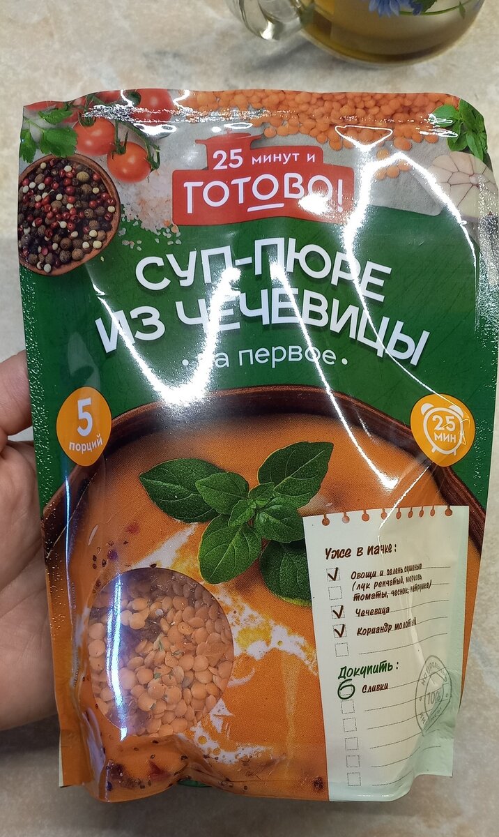 Я люблю суп на мясном бульоне. Знаю, что многие едят овощной. Но мое семейство привыкло к мясному. Бульон у меня есть всегда. Я отвариваю куриную грудку или несколько крыльев индейки. Бульон разливаю по контейнерам, мясо распределяю пропорционально и замораживаю. Так что приготовление супа достаточно быстрый процесс. Сегодня я купила в Пятерочке вот такой вот Суп-пюре из чечевицы. По акции он стоил 109 рублей. Немного разморозила контейнер с бульоном. Порезала 4 средних картофелины. Резала покрупнее так как готовлю в мультиварке. Затем все засыпала в эту самую мультиварку.