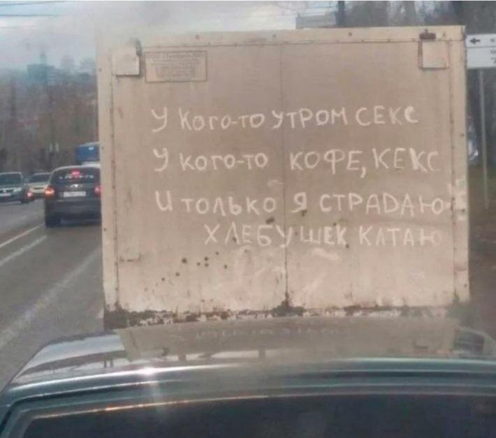 Российские автолюбители любят украшать свой автомобиль для привлечения внимания к своему транспорту и к своей персоне. Зачастую прикольный текст размещенный на автомобиле веселит людей, которые даже вообще не понимают юмор. Потому что в качестве надписей на автомобиле можно увидеть все что угодно. В этой небольшой подборке удалось собрать несколько фотографий со смешными надписями на автомобилях. Фотографии смешных надписей на автомобиле 1) Как говориться кто на что учился. Секс, кофе и кекс — это конечно же очень хорошо. Но без хлебушка долго не проживешь. Поэтому водитель этого автомобиля делает очень большое, а самое главное полезное дело для многих людей. 2) Зато сразу по надписи становится понятно, что водитель "Тойоты" мужчина. Не зря же есть поговорка: за двумя зайцами погонишься – ни одного не поймаешь. Никогда лучше не браться за два дела сразу, а то успеха не объешься ни в одном. Вот теперь молодому человеку придется оттирать эту не совсем культурную надпись. А ототрётся ли?