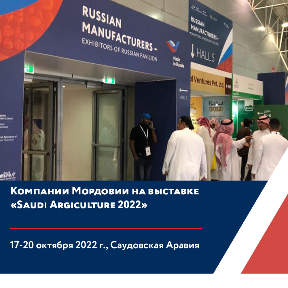 17 по 20 октября в Саудовской Аравии прошла 39-я Международная агропромышленная выставка «Saudi Argiculture 2022». Национальная экспозиция «Made in Russia» на SaudiAgriculture – это крупнейшая национальная экспозиция не только в этом году, но и за всю историю выставки. АО «Российский экспортный центр» при поддержке Министерства сельского хозяйства Российской Федерации организовал национальную экспозицию общей площадью 1 188 кв.м, на которой свою продукцию представили 55 отечественных производителей экспортеров продукции АПК,. Среди которых были две компании из Мордовии: - торговый дом «Фуд Экспорт», представляющий халяль-продукцию, производимую на АО Птицефабрика «Чамзинская»; - компания «Карпай», которая занимается производством и реализацией жареных семечек подсолнуха и других снеков. В первый день работы выставки российскую экспозицию открыли, Министр сельского хозяйства Российской Федерации Дмитрий Патрушев, генеральный директор Российского экспортного центра Вероника Никишин
