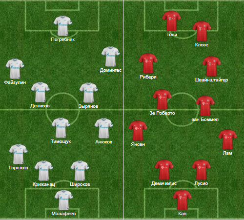 В ответной игре Дик Адвокат не мог задействовать дисквалифицированного Аршавина и намеревался, как и «Бавария», сыграть 4-4-2, где Домингес с Погребняком составили бы дуэт нападающих. Однако, несмотря на все кадровые проблемы, «Зенит» играл по привычной системе. Это вполне вписывалось в характер того «Зенита»: если верить Аршавину из книги Игоря Рабинера, питерцы вообще не разбирали игру соперников (даже «Баварии»), а всегда отталкивались от своего футбола. Верится с трудом, но факт есть факт: перестроений не произошло, Домингес просто заменил Аршавина в старте.