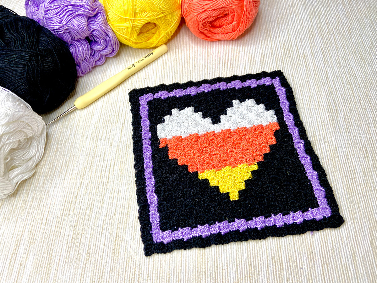 Ближе к Хеллоуину можно часто встретить своеобразные сладости с трехцветной окраской. Полосатые конфетки белого, желтого и оранжевого цвета являются своеобразной визитной карточкой приближающегося праздника. Вот и среди моих подставок под чашку в технике С2С есть такой аксессуар с конфеткой в форме сердечка в традиционных цветах Хеллоуина.