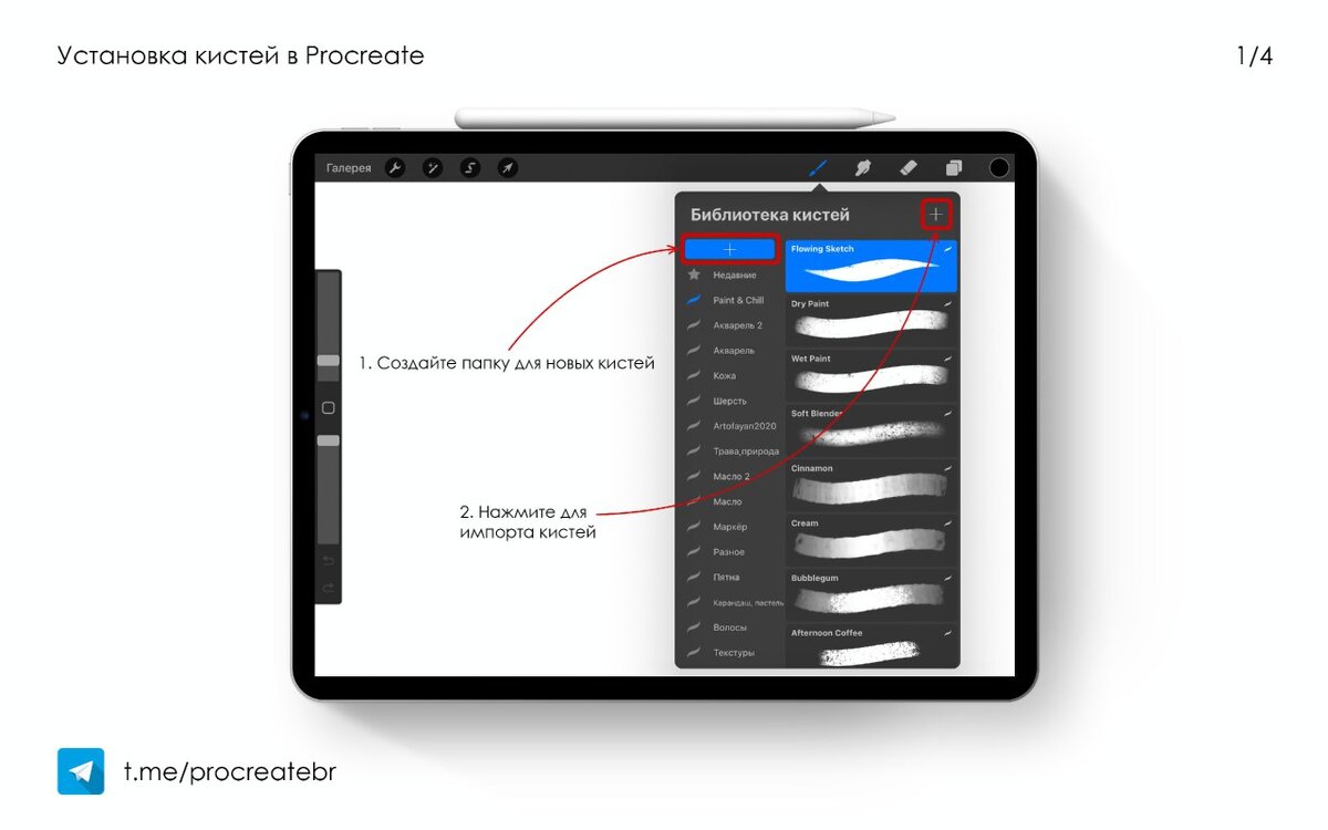 1. Скачайте кисти на iPad или сохраните с ПК в iCloud/Dropbox (Если загружаете сразу на iPad, то необходимо разархивировать кисти с помощью приложения Unzip или iZip). 2. Создайте новый холст и откройте панель "Кисти". 3. Создайте папку для новых кистей. 4. Нажмите на "+" для импорта кистей. 5. Нажмите на "Импорт" в открывшемся окне. 6. Найдите загруженный файл кисти на iPad 7. Нажмите на кисть, которую хотите установить. 8. Готово. Пользуйтесь на здоровье! Кисти можно бесплатно скачать в телеграм канале