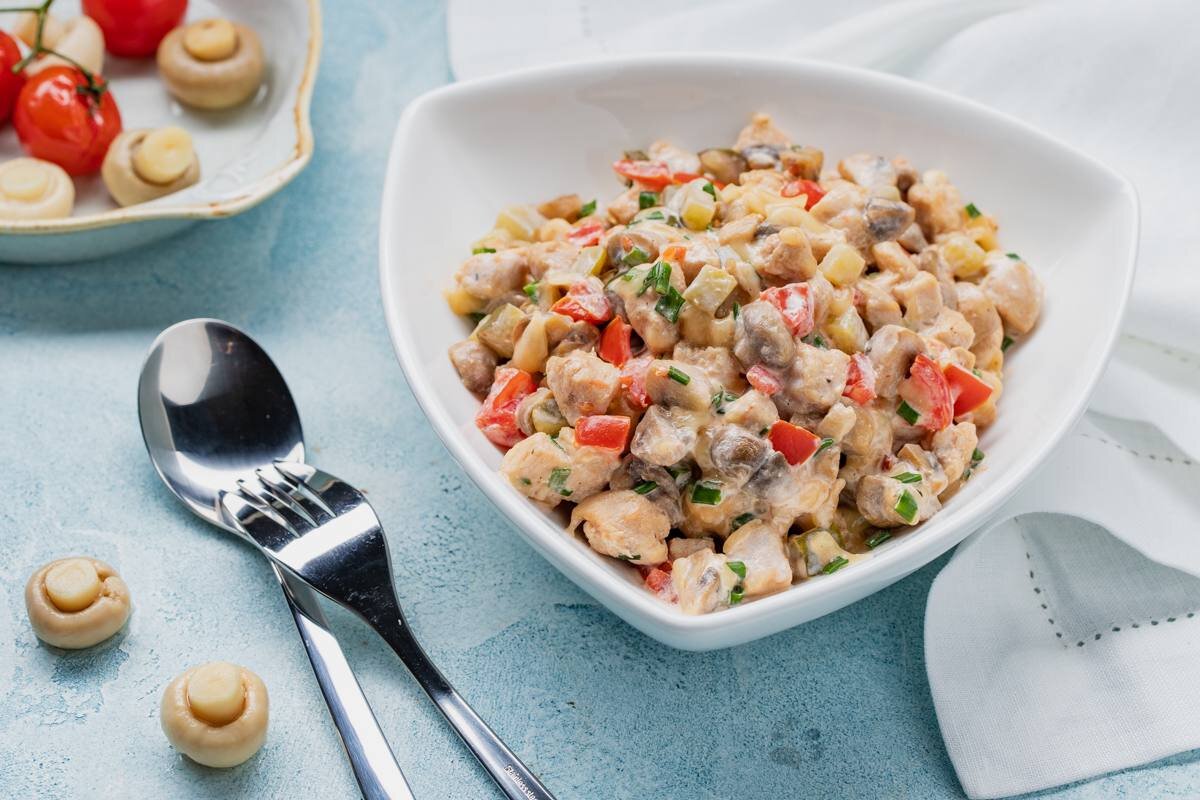 Теплый салат с грибами и курицей 📖 Ингредиенты: - Куриное филе - 200 г. - Шампиньоны - 200 г. - Огурец маринованный - 1 шт. - Зелёный лук - несколько перьев - Твердый сыр - 50 г. - Помидор - 1 шт. - Соль, перец - по вкусу Для заправки: - Сметана - 1 ст. л. - Горчица - 0,5 ст. л. - Лимонный сок - пара капель 🧑🏻🍳 Приготовление: 1. Грибы нарезать на крупные кусочки и обжарить на сковороде до полного испарения жидкости. 2. Куриное филе нарезать на кубики и добавить в сковороду к грибам. Тушить до полной готовности грудки. В конце добавить соль и перец по вкусу. 3. Маринованный огурчик, свежий помидор нарезать некрупными кубиками. Зеленый лук мелко покрошить. Сыр натереть на крупной терке. Смешать все ингредиенты. 4. В сметану добавить горчицу и пару капель лимонного сока, перемешать и заправить салат.