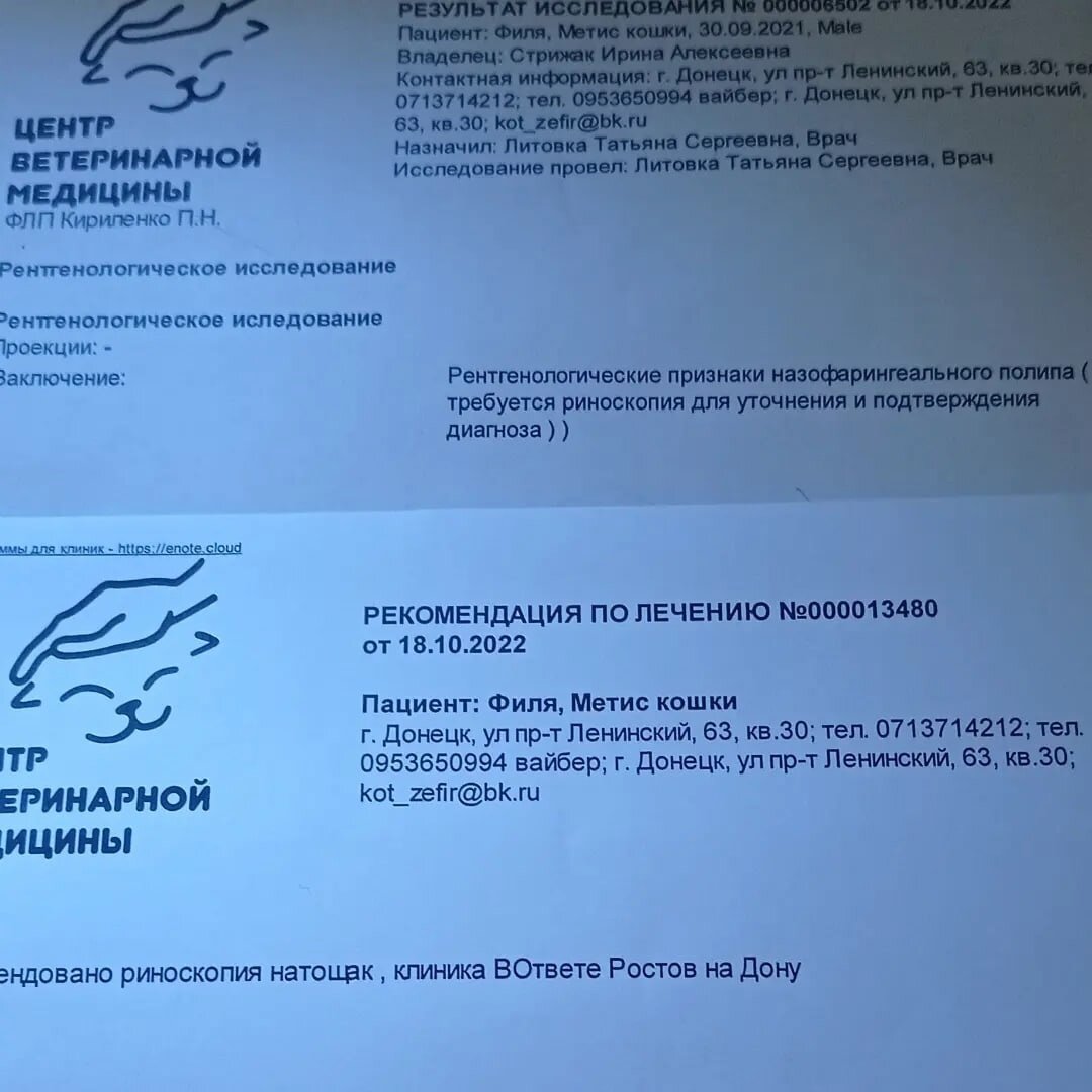 Друзья, нужна помощь. Как вы знаете волонтера Ирину Стрижак направили в ветклинику в Ростов-на-Дону, где есть риноскоп. Филе и Дане нужна операция по удалению полипов, врач,которая делала рентген рекомендовала клинику "Вот Вете" в Ростове, но оказалось у них сейчас нет риноскопа. Долгожданная поездка: теперь все ясно с Нюшей и Космосом, а вот братики, как всегда, под вопросом Далеко поехать волонтер не может, не на кого оставить приют. Волонтер шерстит информацию, но есть предположение, что не все выкладывают в свободный доступ. Естественно город волонтер не знает и знакомых там нет. Операция жизненно необходима, Филя очень задыхается и полипы увеличиваются. Дане пока что получше по сравнению с братиком. Как это сделать и во сколько обойдется операция ещё не знаем, думаем не дёшево плюс дорога. Но нужно спасать котиков. Пожалуйста помогите. Помочь домашним мини-приютам Донбасса из блога #Мими_кися вы можете привычным способом, как и раньше - просто нажав здесь