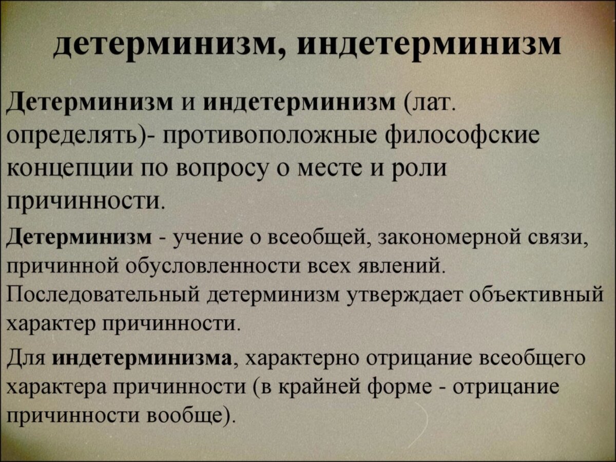 ДЕТЕРМИНИЗМ И ИНДЕТЕРМИНИЗМ (лат. determinare-определять). —Детерминизм — учение о закономерной, необходимой связи всех событий и явлений и их причинной обусловленности. Детерминизм идеалисты противопоставляют индетерминизм, т.е. учение, утверждающее, что естественный ход вещей в мире не подчинен закономерности, причинности, что имеется свободная воля, ни от чего не зависящаяся. Буржуазные идеалисты используют философскую слабость некоторых физиков, которые делают неверные, идеалистические выводы об отсутствии причинной обусловленности в мире мельчайших материальных частиц. В современной зарубежной буржуазной физике широко распространен индетерминизм. Так, например, некоторые физики утверждают, что электрон обладает «свободой воли» в своем движении. В целях борьбы с научным принципом детерминизма особенно используется так называемый принцип неопределенности Гейзенберга. На индетерминизме основывается идеалистическая, антинаучная «теория» в биологии — вейсманизм-морганизм. Индетермини
