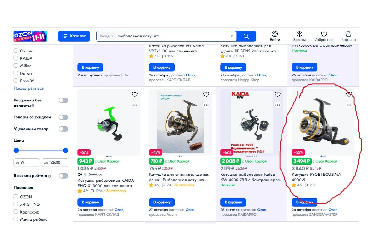 Бытует мнение, что для рыбалки можно купить все на OZON / WB или на прочих маркетплейсах, причем значительно дешевле, чем в обычном интернет магазине, и уж тем более в разы дешевле, чем в обычном рыболовном магазине. Многие знакомые тоже так думают, решил изучить это вопрос по-новой, вдруг, что-то изменилось за последние полгода.😀 Зашел на сайт популярного маркета, в поисковик вбил "рыболовная катушка" и смотрю, что там мне предлагается... Для примера заметил знакомую мне модельку катушки Ryobi Ecusima 4000. Интересная инфа: Название катушки забиваю в поисковик и захожу в парочку известных рыболовных интернет магазинов ( скрин выше) При покупке в интернет магазине, вы заплатите за доставку, что-то около 300 рублей Так же посмотрел свеженький прайс, оптовика, что перепродает мелким магазинам, те же самые катушки. Надо сказать, данные товары не его профильные, потому цены не самые лучшие, но для примера, самое оно. Проанализируем полученную информацию. Разница между покупкой на OZON