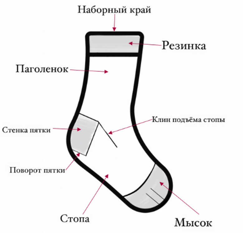 Хоть такая последовательно и является классической, существует множество вариаций в конструкции носков. Например, вязание отложенной пятки, когда работа над пяткой начинается в последнюю очередь. Наборный край. Вязание любого изделия начинается с наборного края, носки не исключение. Наборный край может играть и декоративную роль, все зависит от фантазии. Резинка так же может играть не только функциональную, но и декоративную роль. Этой частью носка при необходимости можно пренебречь и перейти после наборного края сразу к вязанию паголенка. Паголенок - это часть носка, которая находится на голени. Он располагается между резинкой и пяткой. Паголенок может быть связан лицевой / изнаночной гладью, узором или резинкой. Стенка пятки -любая пятка начинается со стенки, не все стенки похожи друг на друга. Например, в пятке бумеранг стенкой будет первая половина пятки и обычно стенкой ее никто не называет. Поворот пятки - та часть без которой носок бы не был носком. В этом месте формируется закр