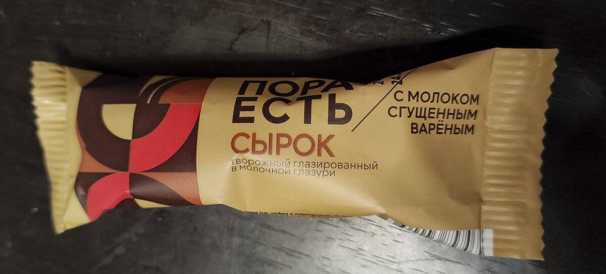 На самом деле, это такое название сырка. «Пора есть» — новая торговая марка от «Ростагрокомплекса». В публикациях часто этот сырок называют «сырком для бедных» от производителя премиальных сырков «Б.Ю. Александров» вместе с маркой «Своя корова». Но спешу вас огорчить. «Своя корова» всё-таки продукт состоящий всем нутром из пальмового масла (опасайтесь всех молочных продуктов с названиями «корова», «бурёнка», «от фермера» — они в 90% с растительными заменителями молочного жира). «Своя корова» кстати появилась в саратовских «Пятёрочках» по цене в районе 20 рублей, но потом пропала. Видимо покупать такой продукт никто не стал. Я сам даже на пробу не стал брать это «нечто». «Пора есть», в отличие от пальмовой «Коровы» в основе имеет всё же творог. Но глазурь конечно из заменителей (я знаю лишь две марки сырков в России, глазурь которых из нормального шоколада, и я о них уже писал). Вот он состав. Сгущённое молоко — действительно сгущённое молоко. Глазурь из кокосового масла. В целом к сост