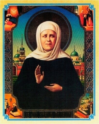 - О блаженная мати Матроно, душею на небеси пред Престолом Божиим предстоящи, телом же на земли почивающи, и данною ти свыше благодатию различныя чудеса источающи. Призри ныне милостивным твоим оком на ны, грешныя, в скорбех, болезнех и греховных искушениих дни своя иждивающия, утеши ны, отчаянныя, исцели недуги наши лютыя, от Бога нам по грехом нашим попущаемыя, избави нас от многих бед и обстояний, умоли Господа нашего Иисуса Христа простити нам вся наша согрешения, беззакония и грехопадения, имиже мы от юности нашея даже до настоящаго дне и часа согрешихом, да твоими молитвами получивше благодать и велию милость, прославим в Троице Единаго Бога, Отца, и Сына, и Святаго Духа, ныне и присно и во веки веков. Аминь.