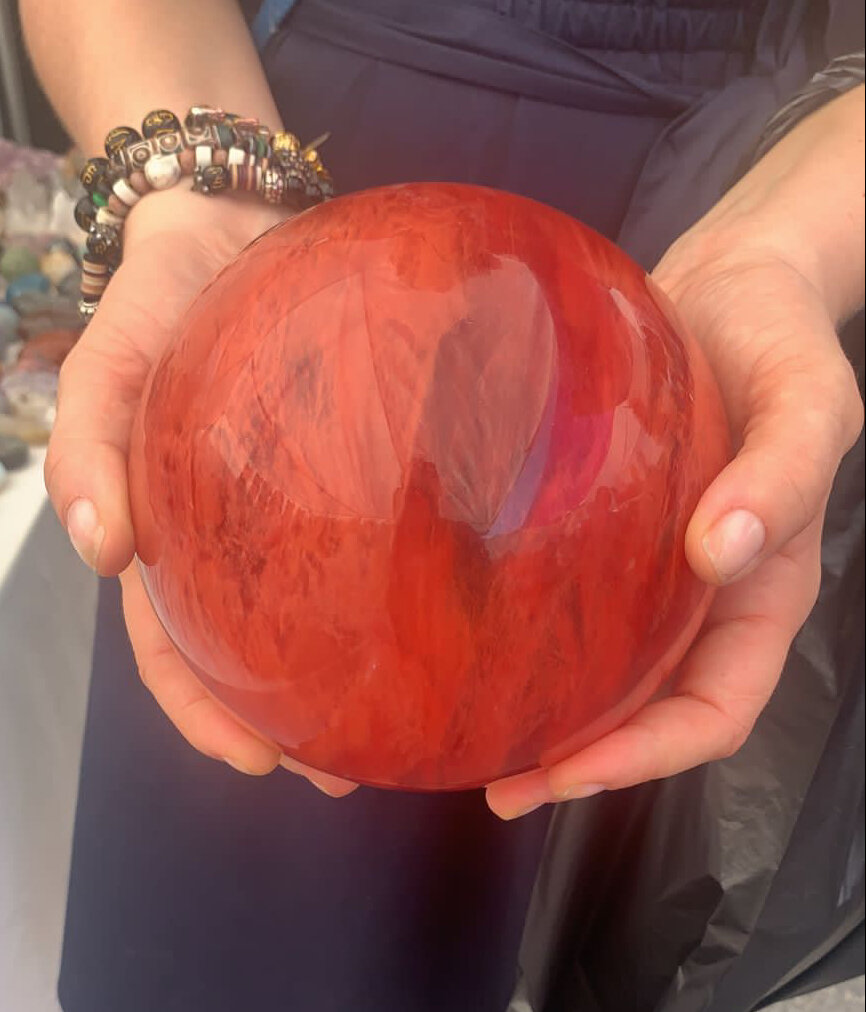 Очередная история про реализацию мыслей. Я прямо поражаюсь, как так все получается? Несколько лет назад ко мне в Инстаграм постучались пара продавцов камней из Индонезии. Забросали меня фотками невероятной красоты камней, среди которых я увидела фантастической красоты красный кварц, от которого у меня дух захватило просто. Начала выяснять, какой размер, какая цена. Фото было сделано на травке и никакого понимания размера камня не было. Продавец путался и писал какие-то непонятные системы измерений, я заколебалась с Гугл-переводчиком. Но решила рискнуть, потому что огненный шар меня поразил в самое сердце!! Отобрала по фото ещё несколько шаров, перечислила оплату сто долларов через пейпал, и долго ждала отправки. Нервничала. И правильно нервничала, как оказалось через неделю. Потому что когда мне прислали фото посылки, отправленной мне, единственное, что я там точно смогла прочесть, так это вес! Вес был всего 400 грамм!! Это смешно для четырёх шаров. То есть они были очень мал
