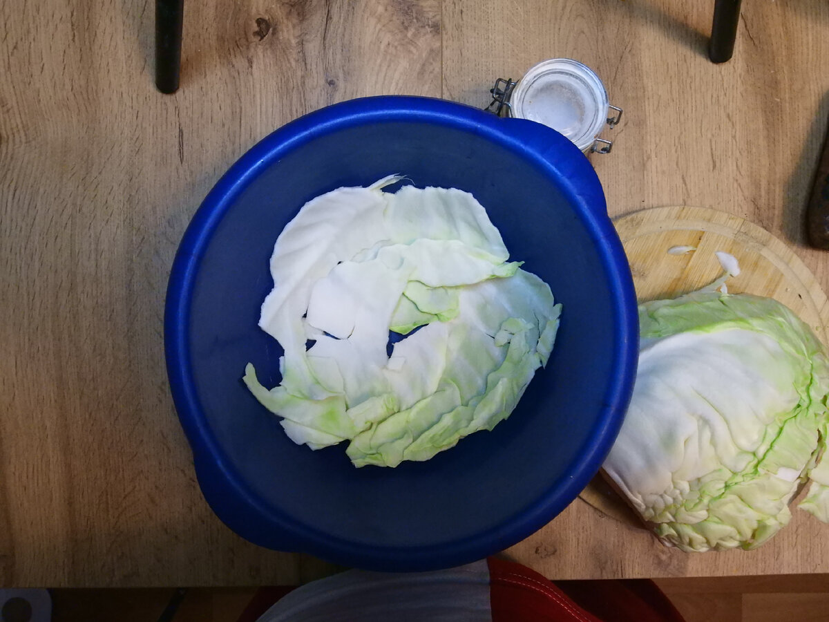 Сегодня хочу поделится с вами рецептом квашенной капусты своей бабушки, он получается кисловатым, хрустящей, а самое главное очень вкусной. Ингредиенты: 1. Капуста - 1кг 2. Морковь - 1шт. 3. Лук - 1 шт. 4. Соль - 2 ст.л Рецепт: 1. Подготавливаем все ингредиенты, в кастрюлю и миску в которой будет настаиваться наша капуста и в низ полностью застилаем листьями капусты. 2. Капусту нарезаем соломкой 3. Морковь очищаем и натираем на крупной терке. 4. Лук так же очищаем и нарезаем полукольцами. 5. Перемешиваем все вместе в миску в которой будет стоять наша капуста и добавляем к ней соль. 6. Затем толкушкой, разминаем всю капусту что бы она дала сок и все тщательно перемешиваем и сверху укрываем полностью листьями капусты. 7. Ставим под гнет и оставляем настаиваться 6-7 дней, периодически протыкать деревянной шпажкой, для того что бы выходил лишний газ. 8. По истечению 7 дней, капуста дала сок и заквасилась, поэтому сначала подготавливаем банку, для этого мы стерилизуем банку и к