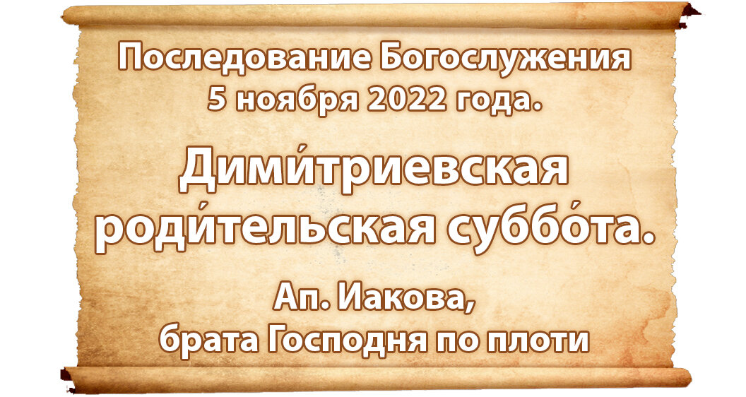 По ссылке на страницу последования богослужения можно скачать в разных форматах службу 5 ноября 2022 года. Димитриевская родительская суббота. Ап. Иакова, брата Господня. Прямая ссылка на полное последование богослужения 5 ноября 2022 на резервной странице. Резервная страница проекта: https://posledovanie.my1.ru/index/0-2