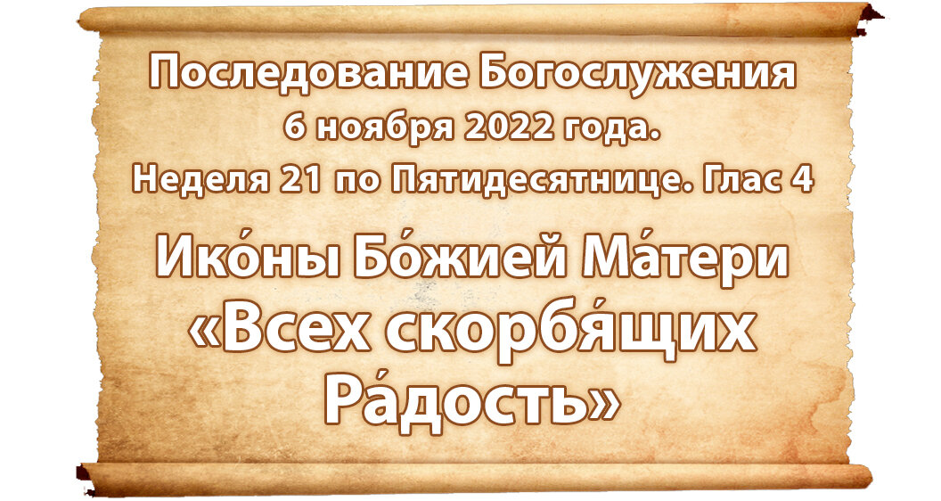 По ссылке на страницу последования богослужения можно скачать в разных форматах службу на Неделю 21 по Пятидесятнице. Иконы Божией Матери "Всех скорбящих Радость". Глас 4. Прямая ссылка на полное последование богослужения 6 ноября 2022 на резервной странице. Резервная страница проекта: https://posledovanie.my1.ru/index/0-2