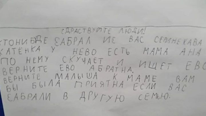 Оно появилось на дверях подъезда в доме №1 10-го микрорайона, сообщает Lada.kz. В нём говорится, что «у нево есть мама ана по нему скучает и ищет ево. верните его абратна». Неизвестный, но судя по стилю, орфографии и пунктуации, маленький автор давит и на совесть вероятных похитителей котёнка: «вам была бы приятна если вас забрали в другую семью». Пользователи сети оценили отношение ребенка в животным. Многие написали слова сочувствия и поддержки: «Чето я аж прослезилась « «Прям до слёз,мы все верим что котенок найдется» «Желаю тебе малыш, что-бы тебе вернули котёнка, верь в чудо она збудется! Умничка ❤️» Насколько известно на данный момент Orda.kz, котёнок в Актау еще не нашёлся, но многие стали пристальней вглядываться в уличных бродяг.