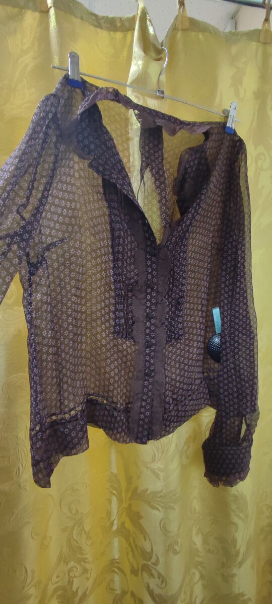 Не оставляю поиски натурального шелка в секонд-хенде, ещё много чего хочется, особенно трикотажного шёлка. Нашла нежную полупрозрачную блузку, на коричневом фоне мелкие бежевые цветочки, воротник-стойка, изысканные кружева вдоль планки с пуговками и внизу манжет. Цена более чем -350р Блузка - сама нежность, невесомая, я бы сказала в новом состоянии. "Голая" блузка, сверху желательно надеть жакет. Блузка очень нравится, но не осмелюсь надевать, а скрывать такую красоту ( имею ввиду блузку, не себя) под жакетом не вижу смысла. Блузка итальянского бренда Scervino street, модели этого бренда в интернете Коричневый топ из натурального шелка от MaxMara, цена 350р. Шёлк переливающийся, восхитительного качества. Еще одна воздушная и полупрозрачная блузка-топ с V-образным вырезом из шелка, не смогла примерить, мала. Белоснежный топ из натурального трикотажного шёлка, цена 350р, топ новейший. Красавица рябина радует яркими красками, полюбуемся.