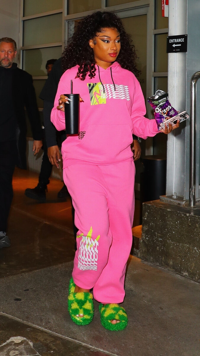 Осень — не повод отказываться от цветных вещей. Рэп-исполнительница Megan Thee Stallion показывает отличный пример того, что можно носить в пасмурный сезон. Звезда выбрала спортивный костюм в оттенке фуксия, который дополнили броскими зелеными меховыми слайдами.