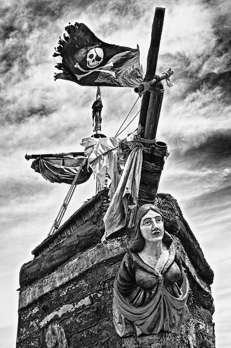 Корсар носил тельняшку и серьгу. Когда его Нептун короновал, он числился сопливым недоучкой. Возможно, бедность довела до ручки. Возможно, сильно нравился штурвал, надутый парус, мокрые бока. На мачту водрузив Весёлый Роджер, смеялся капитан с небритой рожей, ославленный в портовых кабаках. У капитана был один секрет — у моряков всегда они бывают — крылатая фигура. Носовая. К всеобщей пользе, т