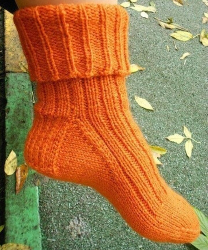 Женские носки шерстяные, размер 38-39 . Пряжа Семеновская Наташа, 250 м./100 г., 95% шерсть, 5% акрил. На носки ушло около 120г. пряжи, связано на спицах №2,5. Описание : Набираем 51+17=68 петель. 51 петля пойдет на носок, дополнительные 17 мы убавим в нулевом ряду, это на эластичность наборного края. Замыкаем в кольцо, замечаем начало ряда. Нулевой ряд: *2 лиц. 2 вместе изн.*, повторять *-* до конца ряда. Далее 61 ряд резинкой *2 лиц., 1 изн.* В следующем ряду провязать 1 лиц., следующие 24 петли отложить пока, это будущая верхняя часть стопы. Оставшиеся 27 петель – пятка. Пятку начинаем вязать с изнаночного ряда. ряд 1 (изнаночный): 1 п. снять, не провязывая, как изнаночную, далее изнаночными до конца ряда. В середине ряда выполнить 1 убавление, провязать 2 вместе изн., на спицах для пятки осталось 26 петель. ряд 2: 1 п. снять, не провязывая, как изнаночную, далее повторять *1 лиц., 1 п. снять, не провязывая, как изнаночную, нить за работой* до конца ряда. ряд 3: 1 п. снят